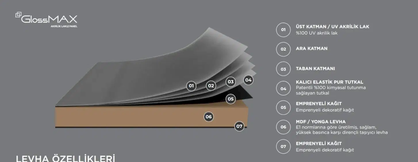 Azerbaycan'da mutfak tadilatı yaparken, GLOSSMAX yüksek parlaklıkta levhalar mükemmel bir seçenektir. Melamin kaplı MDF veya Yonga Levha ile dayanıklı ve estetik bir yüzey elde edebilirsiniz.
